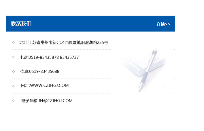傳真:0519-83435688    郵編:213135    網址:WWW.czjhgj_com.sz-xnbz.com    電子郵箱:JH@czjhgj_com.sz-xnbz.com